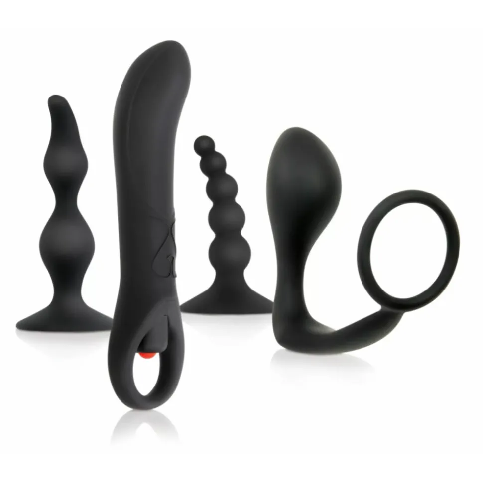 1: Prostaatstimulator zonder trillingen (Kralen) Graduele kralen die een ontspannen verkenning van de prostaat bieden, met een flexibele schacht en een zuignap aan de basis voor handsfree plezier.9 cm lang, 7,6 cm inbrengbare lengte, 2,5 cm breed. 2: Prostaatstimulator zonder trillingen (Curves) Flexibele siliconen die zich aanpassen aan de lichaamscurves en een zuignap aan de basis voor handsfree plezier. 11 cm lang, 10,7 cm inbrengbare lengte, 3 cm breed. 3: Prostaatstimulator zonder trillingen met elastische penisring. Flexibele schacht voor een goede en comfortabele pasvorm. 5 cm penisringbreedte, 9,5 cm inbrengbare lengte van de stimulator. 4: Prostaatmassager met trillingen. Grote diameter voor gevorderd spel, 1 trilsnelheid, 1 AAA-batterij niet inbegrepen. Lengte 14 cm, inbrengbare lengte 9,5 cm, 2,5 cm breed.