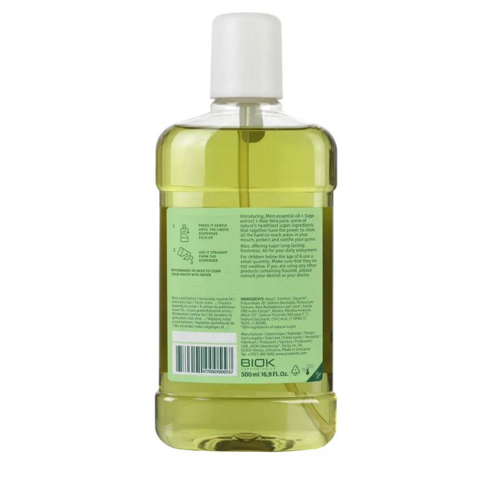 ECODENTA Mondwater Multifunctional is een multifunctionele ecologische mondspoeling voor een optimale verzorging van de moeilijk bereikbare gebieden in de mond. Het mondwater bevat extracten van salie en Aloë Vera, maar ook muntolie voor een langdurig fris mondgevoel. Salie en Aloë Vera kalmeren en beschermen het tandvlees. ECODENTA Mondwater Multifunctional voorkomt en vermindert tandplak, een belangrijke oorzaak van tandvleesproblemen. Daarnaast helpt het bacteriën tussen te tanden te verwijderen. De mondspoeling bevat geen alcohol en is een perfecte aanvulling op de dagelijkse tand- en mondverzorging. Het beschermt het gebit tegen tandsteen en biedt een frisse adem.