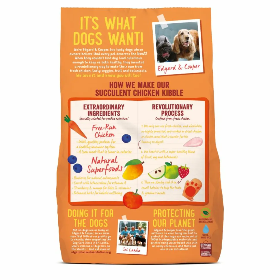 Lekkere brokken gemaakt van 100% vers vlees. Vlees is het belangrijkste ingrediënt voor de voeding van je hond. Vers vlees zit namelijk boordevol proteïnes of eiwitten. En die zijn superbelangrijk voor een gezond leven. Zo draagt scharrelkip bij aan een gezond immuunsysteem en is laag in calorieën. Daarnaast zitten blauwe bessen vol met natuurlijke antioxidanten, wortel bevat veel vitamine A en mango zit vol met vezels en belangrijke vitaminen. De Edgard & Cooper brokjes zijn geschikt voor alle honden, groot of klein, dik of dun, jong en oud.