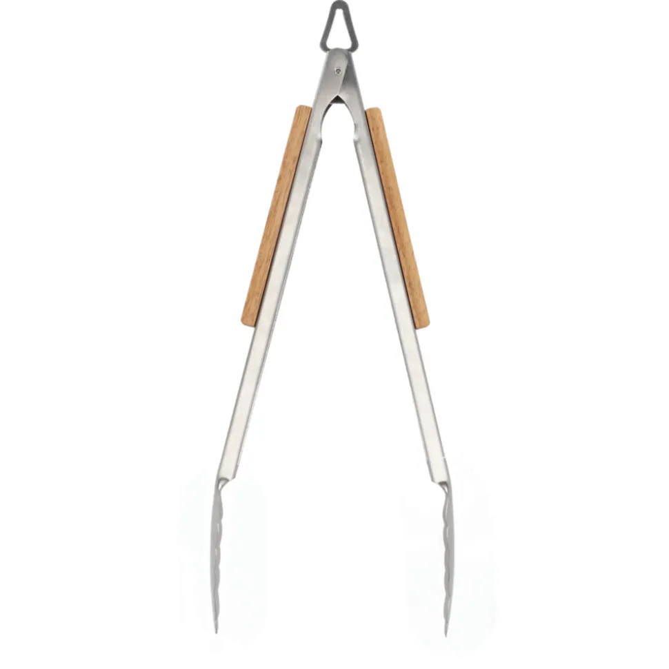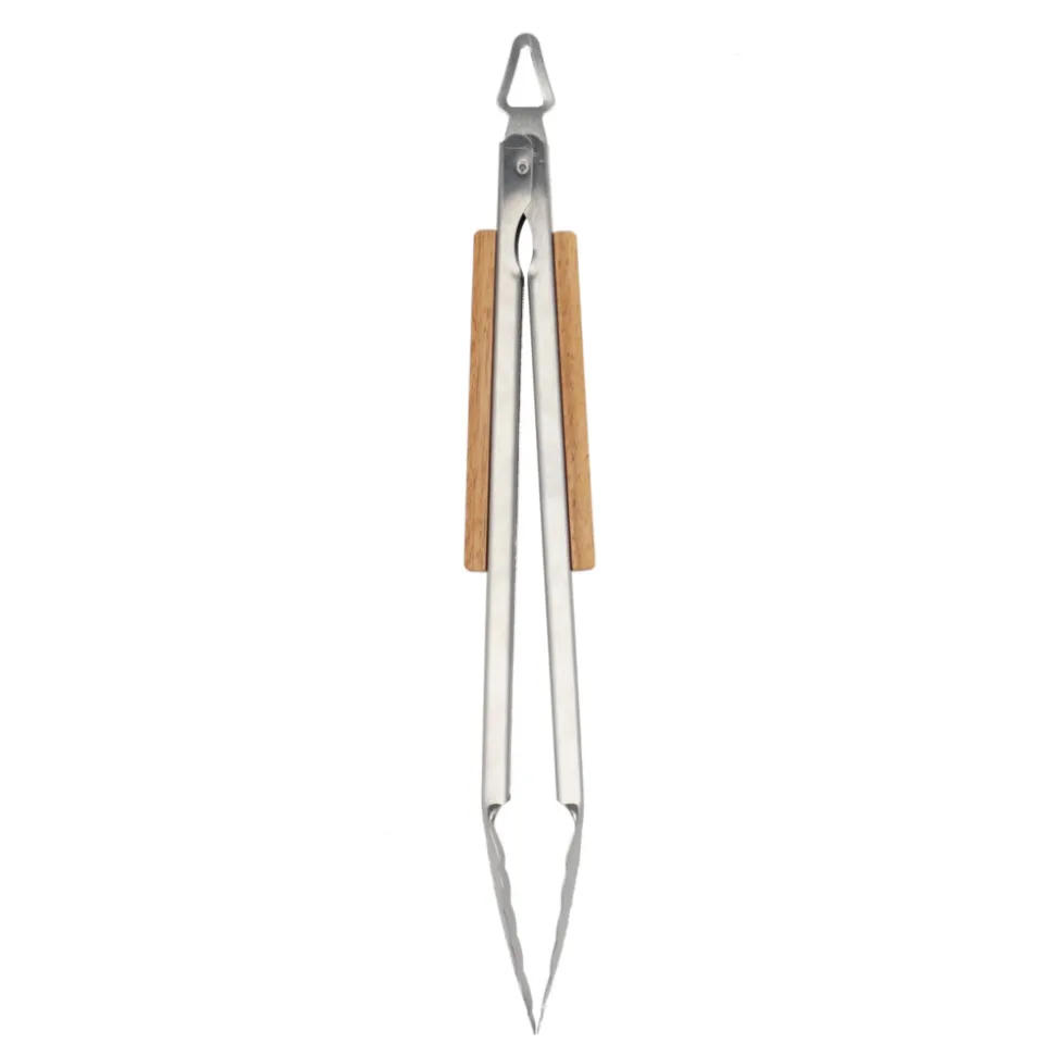 Deze barbeque tangen van roestvrij staal en essenhout gebruik je om warm of koud voedsel om te draaien. De tangen zijn voorzien van een handig oog, waarmee je de tangen gemakkelijk ophangt. Dit gaat gemakkelijk en je handen blijven vrij van oliespetters en vuur. Het vergrendelingsmechanisme is gebruiksvriendelijk.
