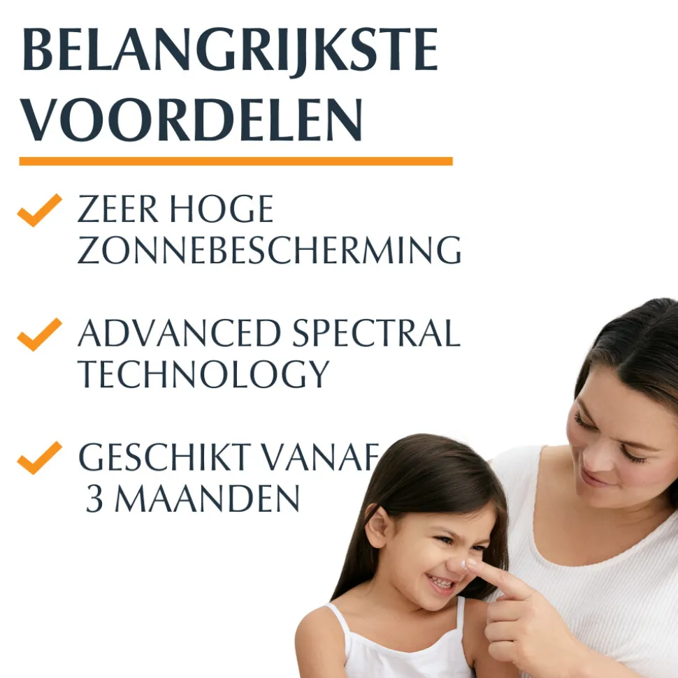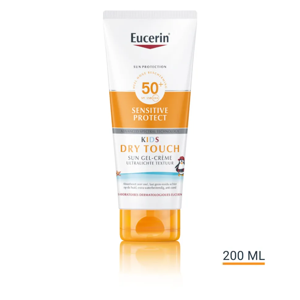 Eucerin Sun Sensitve Protect Kids Gel-Crème SPF 50+ met Advanced Spectral Technology: Combineert UVA/UVB-filters voor een zeer hoge UV-bescherming en antioxidant Licochalcone A, dat vrije radicalen gegenereerd door UV en hoog energetisch zichtbaar licht neutraliseert. Glycyrrhetinezuur ondersteunt het natuurlijk mechanisme van de huid.
