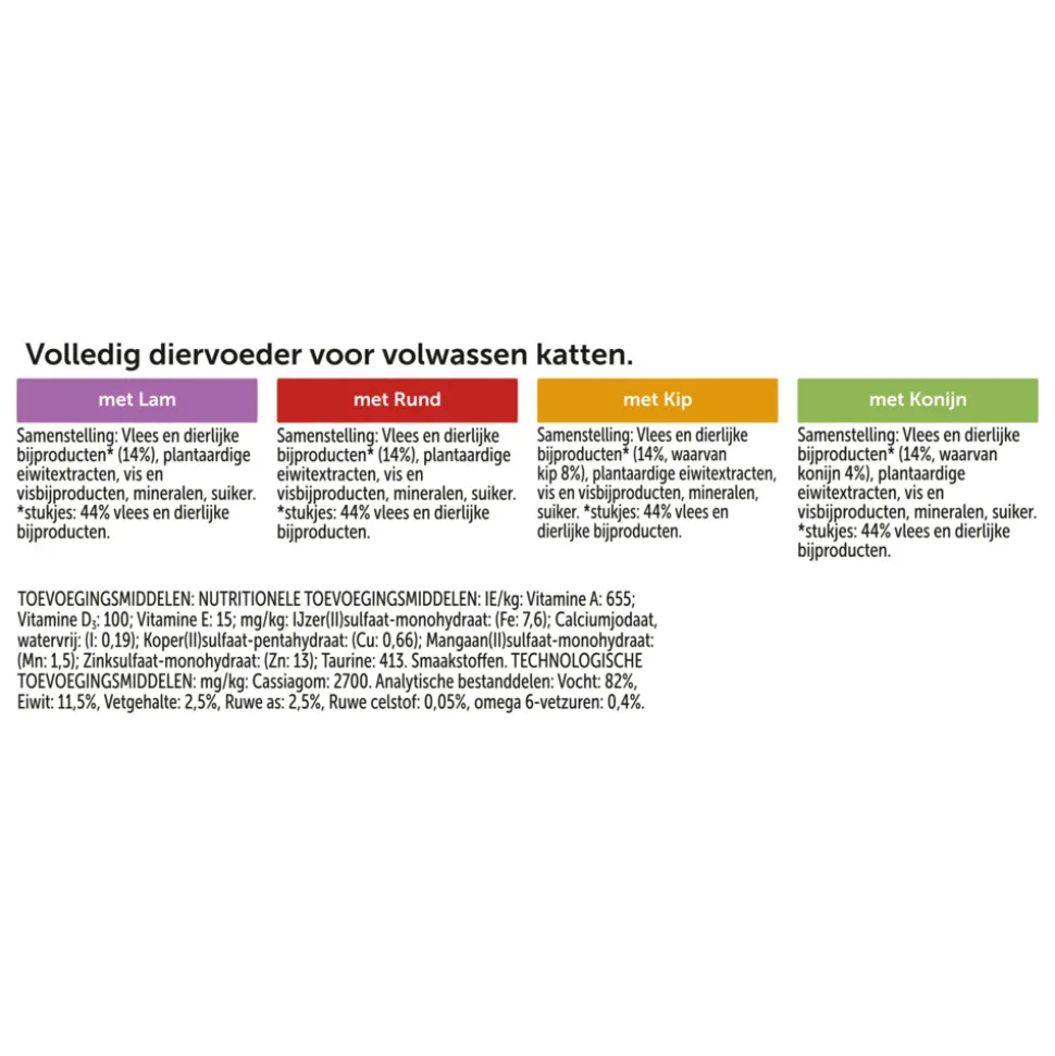 Samenstelling : vlees en dierlijke bijproducten* (14%, waarvan lam 4%), plantaardige eiwitextracten, vis en visbijproducten, mineralen, suiker.