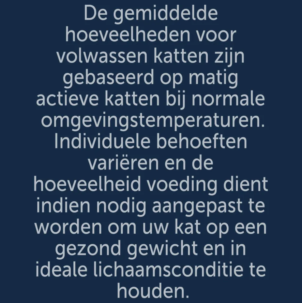 *De gemiddelde hoeveelheden voor volwassen katten zijn gebaseerd op gemiddeld actieve katten bij normale omgevingstemperaturen. Individuele behoeften variëren en de voeding moet indien nodig worden aangepast om jouw kat op een slank, gezond lichaamsgewicht te houden.