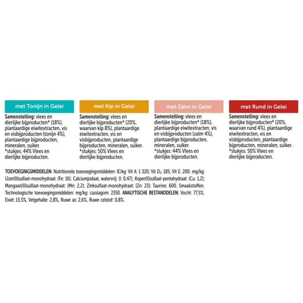 Samenstelling : vlees en dierlijke bijproducten* (18%), plantaardige eiwitextracten, vis en visbijproducten (tonijn 4%), plantaardige bijproducten, mineralen, suiker.