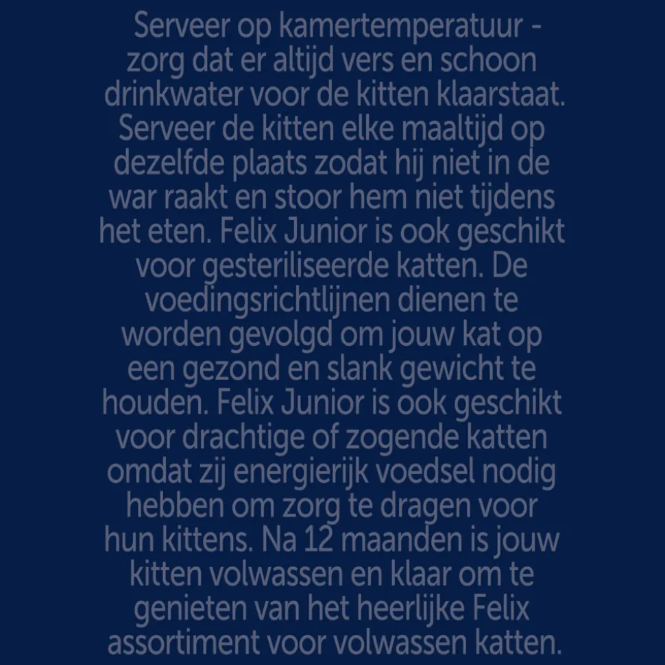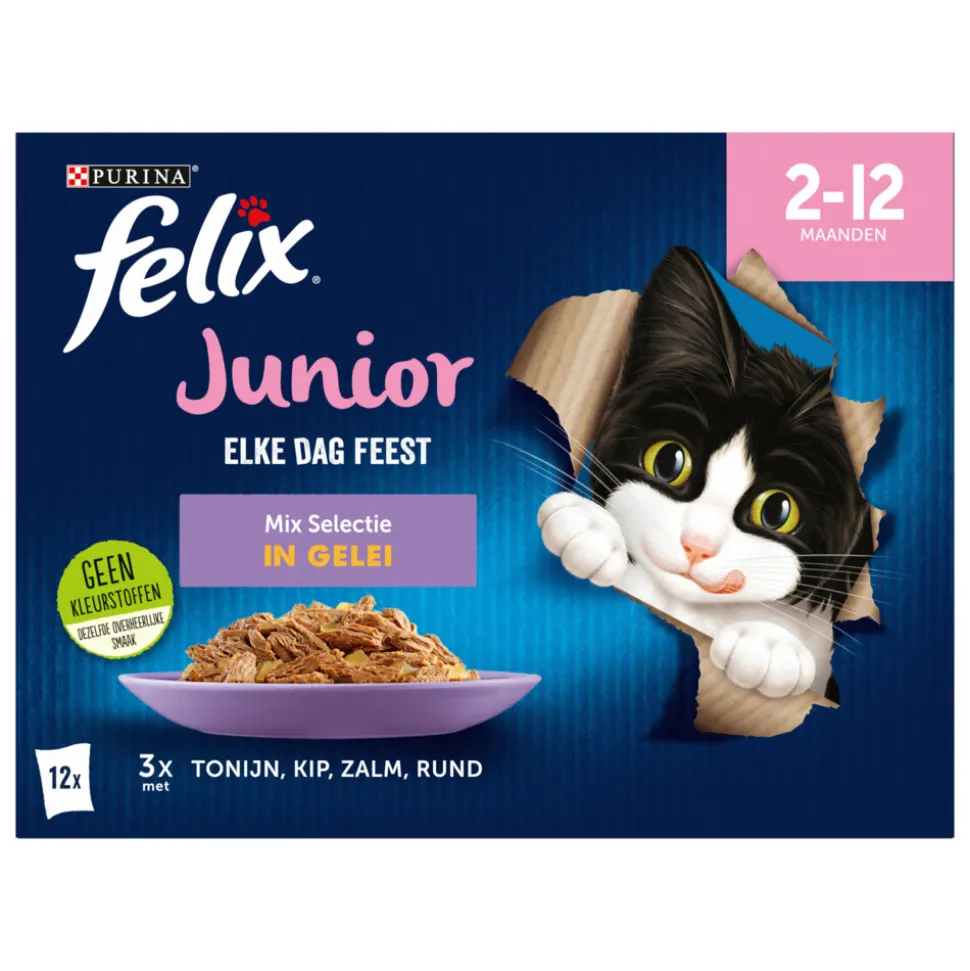 Felix Elke Dag Feest Junior is een assortiment onweerstaanbare maaltijden die er zó lekker uitzien, zó lekker ruiken en zó lekker smaken alsof je het zelf hebt klaargemaakt. Speciaal bereid met malse reepjes in een overheerlijke gelei. Jouw kleine deugniet zal elke keer weer genieten van een onweerstaanbare maaltijd.