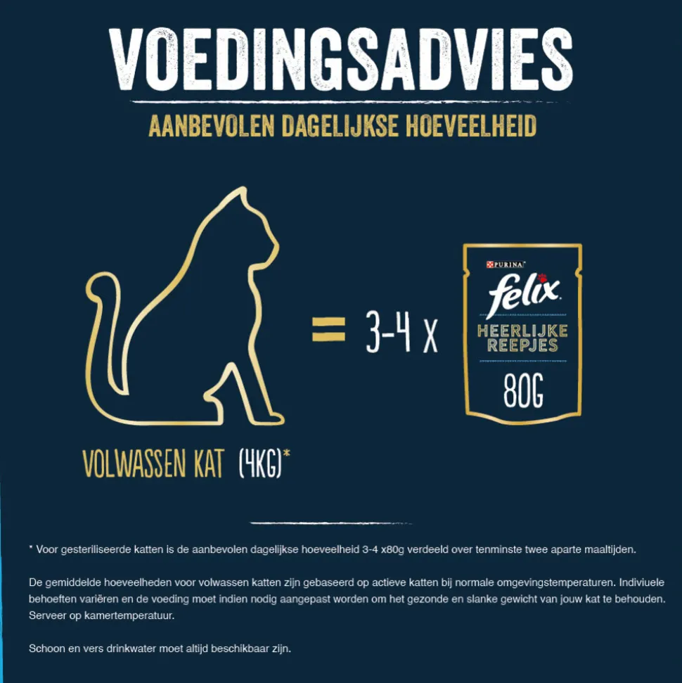Felix Heerlijke Reepjes is evenwichtig, compleet natvoer voor volwassen katten dat je kat van waardevolle voedingsstoffen voorziet, waaronder omega-6-vetzuren en vitamine D & E. Het natvoer bestaat uit zachte stukjes van vlees of vis in een verrukkelijke saus . Het compleetvoer komt in handige portiezakjes voor vers genot bij elke maaltijd. Felix Heerlijke Reepjes ontvang je in twee verschillende variaties, zo wordt iedere maaltijd een smakelijke verrassing!