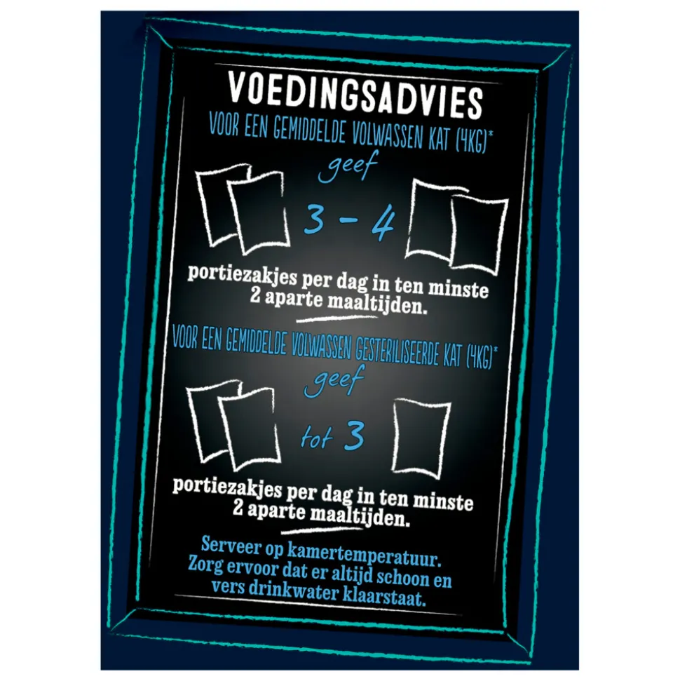 Voor een gemiddelde volwassen kat (4kg) geef 3 tot 4 portiezakjes per dag in ten minste 2 aparte maaltijden.