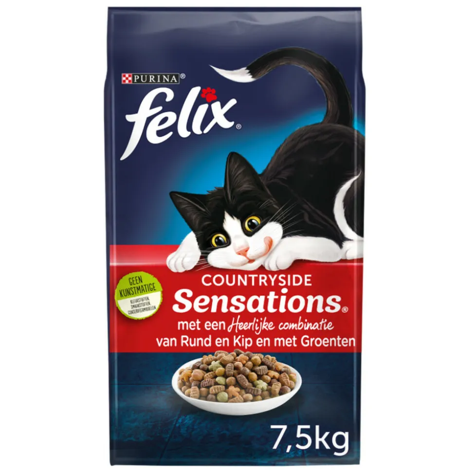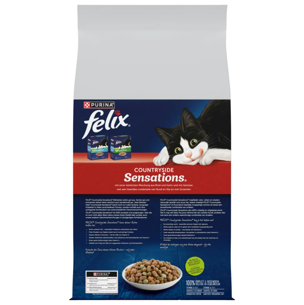 Prikkel iedere maaltijd de zintuigen van je deugniet!Iedere kleurrijke maaltijd Felix. Countryside Sensations zit boordevol heerlijke aroma’s. De verschillende vormen onweerstaanbare, knapperige brokjes hebben sensationele vleessmaken, waaronder die van Rund en Kip. Het is 100% volledig en uitgebalanceerd, zodat je kleine deugniet iedere maaltijd alle benodigde voedingsstoffen krijgt die hij nodig heeft voor een sensationeel leven vol kattenkwaad.