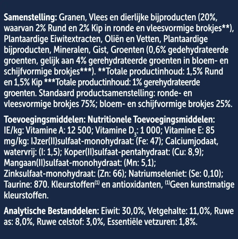 Granen, Vlees en dierlijke bijproducten (10 %*), Plantaardige eiwitextracten, Oliën en Vetten, Plantaardige bijproducten, Mineralen, Gist, Groenten (groene en oranje brokjes: 0,13 % gedroogde groenten gelijk aan 1 % groenten). *gelijk aan 20 % gerehydrateerd vlees en dierlijke bijproducten, met min. 4 % rund in de rode en bruine steak brokjes en met min. 4 % kip in de rode, bruine en lichtbruine brokjes.