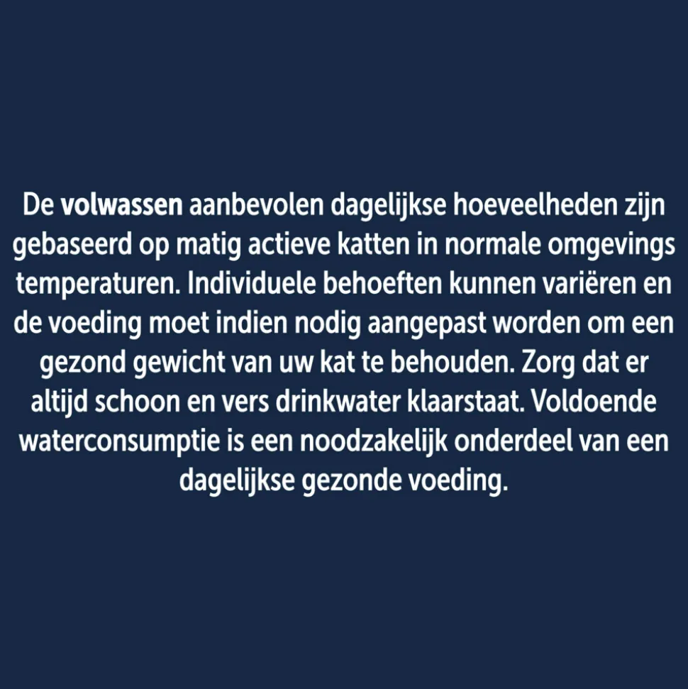 De aangegeven hoeveelheden zijn gemiddelden gebaseerd op de behoefte van normale actieve, volwassen katten in een normale omgevingstemperatuur. Individuele behoeften varieren en de voeding moet indien nodig aangepast worden om het gezone gewicht van je kat te behouden.
