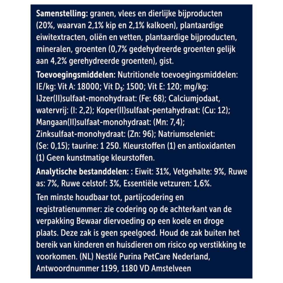 Granen (54 %), Vlees en dierlijke bijproducten (10 %*), Plantaardige eiwitextracten, Oliën en Vetten, Plantaardige bijproducten, Mineralen, Gist, Groenten (groene en oranje brokjes: 0,13 % gedroogde groenten gelijk aan 1 % groenten. *gelijk aan 20 % gerehydrateerd vlees en dierlijke bijproducten, met min. 4 % kip in de lichtbruine brokjes.