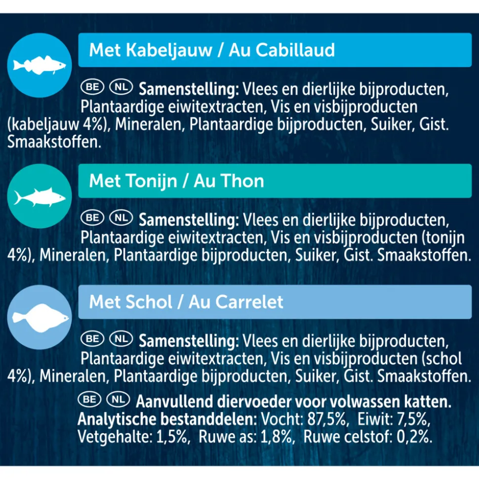 Met Kabeljauw Vlees en dierlijke bijproducten, Plantaardige eiwitextracten, Vis en visbijproducten (kabeljauw 4%), Mineralen, Plantaardige bijproducten, Suiker, Gist. Met Tonijn Vlees en dierlijke bijproducten, Plantaardige eiwitextracten, Vis en visbijproducten (tonijn 4%), Mineralen, Plantaardige bijproducten, Suiker, Gist. Met Schol Vlees en dierlijke bijproducten, Plantaardige eiwitextracten, Vis en visbijproducten (schol 4%), Mineralen, Plantaardige bijproducten, Suiker, Gist. Analytische bestanddelen: Vocht: 87,5%, Eiwit: 7,5%, Vetgehalte: 1,5%, Ruwe as: 1,8%, Ruwe celstof: 0,2%. Toevoegingsmiddelen: Smaakstoffen