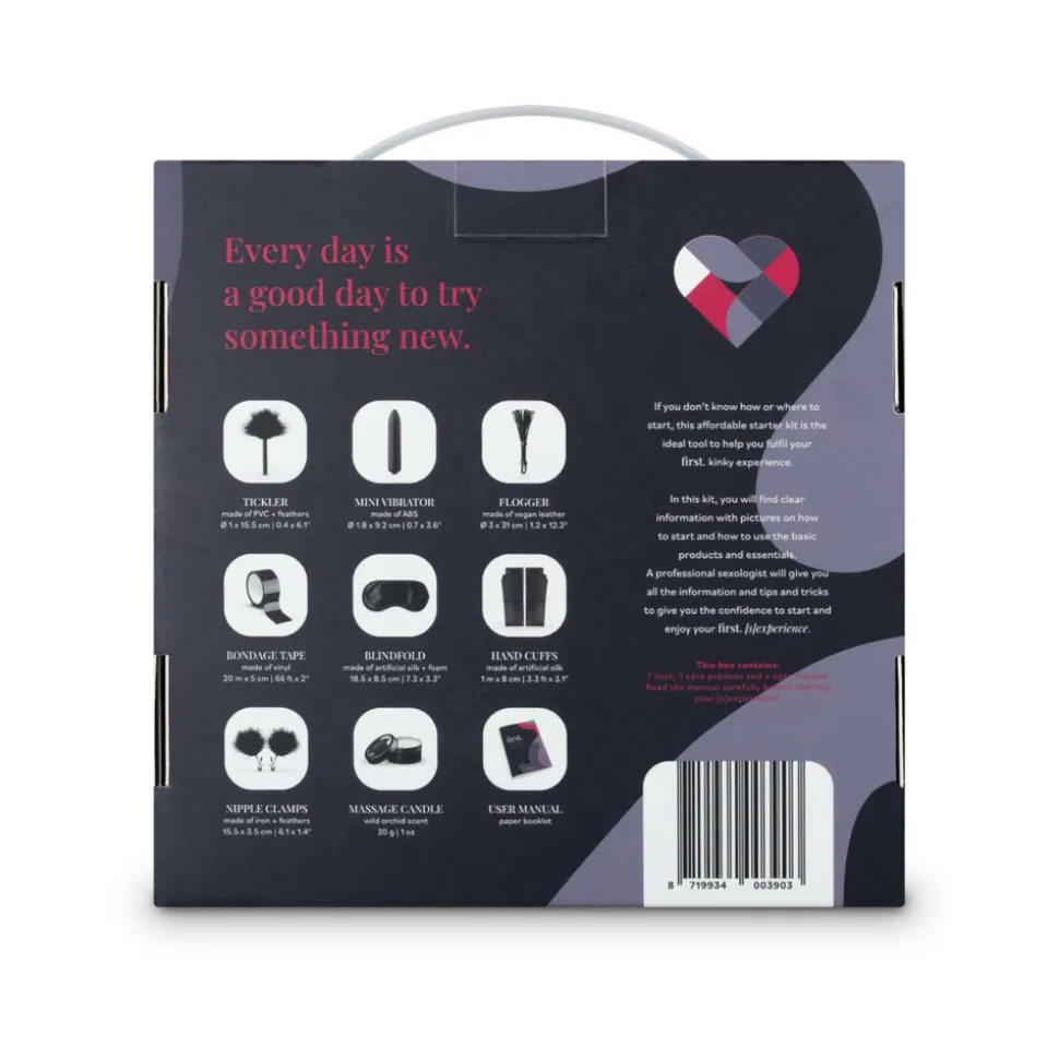 In de box vind je veel moois om elkaar te teasen en te verwennen. Geef elkaar een ontspannende massage met de heerlijk ruikende massagekaars. Blinddoek en boei jouw partner met het satijnen oogmasker en linten. Gebruik de flogger voor een plagerige tik op de billen. Prikkel de huid met de veren kietelaar. Ontdek hoeveel intensiteit jij kunt verdragen met de verstelbare tepelklemmen of ontneem iedere poging tot bewegen met het bondage tape. In de set vind je ook een krachtige bullet vibrator voor een heerlijke stimulatie op al jullie favoriete plekjes. De uitgebreide en eerlijk geschreven handleiding (Engelstalig) is tot stand gekomen in samenwerking met een ervaren seksuloog en staat boordevol uitleg, do’s en dont’s en maakt jullie zelfverzekerd genoeg om aan deze nieuwe ontdekkingstocht te beginnen!