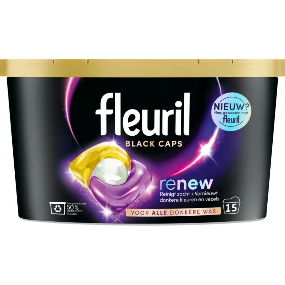 Nieuw? Nee, gewassen met Fleuril Color Caps!Ontdek de handige wascapsules met de innovatieve Triple Renew Formule – de ideale verzorging voor gekleurde kleding! De wascapsules reinigen niet alleen zacht, maar bieden ook de beste verzorging voor je kleuren en vezels: het verwijderdt pluisjes wat resulteert in een glad oppervlak en het maakt je kleuren levendig – zodat je kleding als nieuw aanvoelt en eruitziet! Dit alles wordt gecombineerd met een heerlijke geur die zorgt voor langdurige frisheid. De wascapsules voor gekleurde kleding kunnen zowel in koud als warm water worden gebruikt, en kunnen zelfs als handwasmiddel worden gebruikt. Fleuril Color Caps zijn veilig voor gebruik op verschillende stoffen.Fleuril Black Caps reinigt zacht + vernieuwt kleuren en vezels. Voor alle gekleurde kleding!Vernieuwt kleurenBetoverende geurReinigt zachtLangdurige kleurbeschermingKies Fleuril, het wasmiddel dat verder gaat dan gewone reiniging en geef je gekleurde kleding de zorg die het verdient.Zorg voor je kleding en de planeet: De formule van de Fleuril Black Caps bestaat voor meer dan 90% uit ingrediënten van natuurlijke oorsprong*. De doos van de caps is 100% recyclebaar en gemaakt van 50% gerecycled plastic.Waarschuwing: veroorzaakt ernstige oogirritatie bij contact met de ogen. Kan een allergische huidreactie veroorzaken.* Henkel laboratorium bewijs (Duitsland, 2021).Gemakkelijk te gebruiken: Open de verplakking en plaats de wascapsules in de trommel. Voeg vervolgens je was toe en start het wasprogramma.