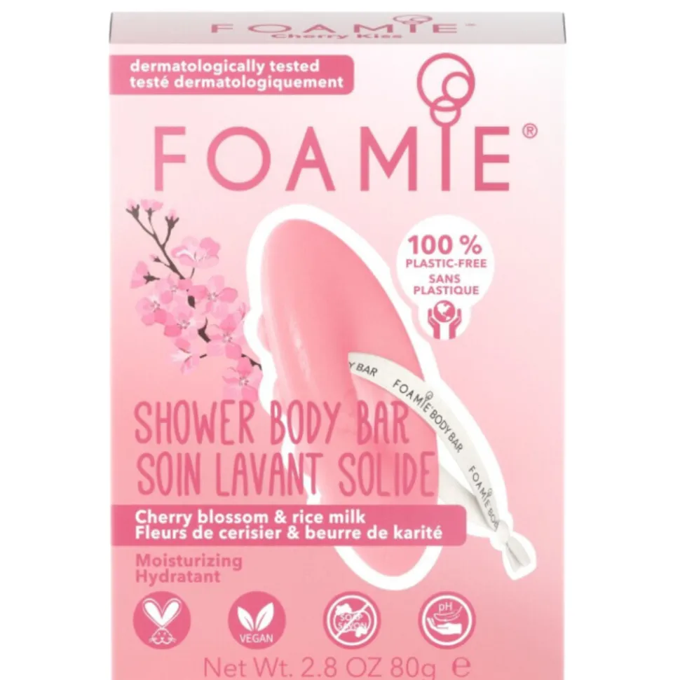 Foamie Shower Body Bar Cherry Kiss is een heerlijk romige zeep die je huid reinigt, verfrist en verzorgt terwijl je huid geniet van een massage dankzij het speciale ontwerp met reliëf. Hang na een heerlijke douche-ervaring de zeep simpelweg op met het handige katoenen koord dat al aan de body bar is bevestigd. De body bar bevat hydraterende rijstmelk dat de huid mild reinigt en heeft een geoptimaliseerde pH-waarde waardoor hij ook uiterst geschikt is voor de gevoelige huid. Foamie Body Bar lijkt op een zeepblok, maar bevat niet, zoals de ouderwetse, conventionele zeepblok, de ingrediënten die de huid uitdrogen of verstoren. Het reinigende ingrediënt in de Foamie Body Bar is namelijk syndet, een alternatief voor zeep dat bekend staat om zijn pH-neutrale eigenschappen. Ook is de body bar vrij van plastic, parabenen en bevat het geen alcohol.