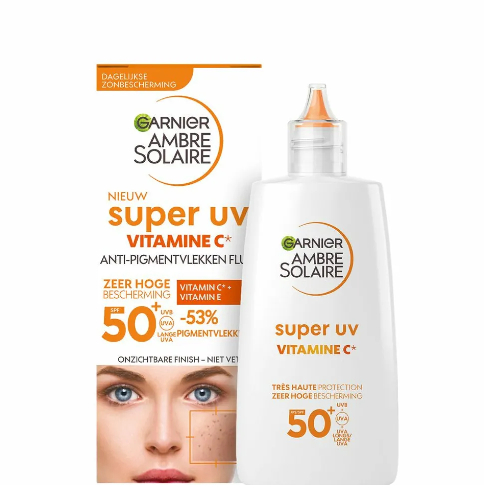 Garnier Ambre Solaire Super UV Vitamine C* Anti-Pigmentvlekken Fluid SPF50+ beschermt jouw huid effectief tegen UVB-, UVA-en lange UVA-stralen. De formule met Vitamine C* en Vitamine E helpt pigmentvlekken die ontstaan zijn door de zon te verminderen en te voorkomen. Klinische testresultaten nadat het product 3 maanden is gebruikt**: -53% zichtbaarheid van pigmentvlekken, +43% stralende huid, +40% zachtere en betere huidtextuur. De zonbescherming is niet vet, plakt niet en heeft een onzichtbare finish. *Vitamine Cg = een afgeleide van Vitamine C. **Klinische studie op 76 vrouwen gedurende 3 maanden.