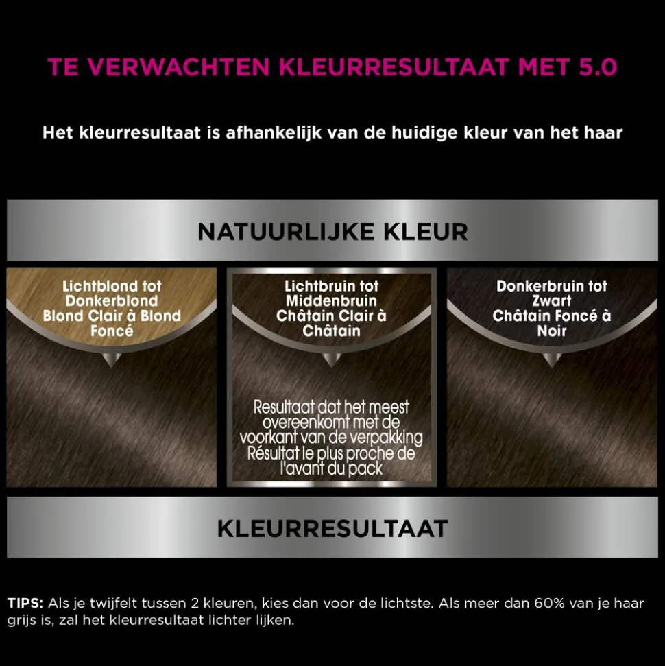 1257557 A – KLEURCRÈME: / CRÈME COLORANTE:PARAFFINUM LIQUIDUM / MINERAL OIL • AQUA / WATER•ETHANOLAMINE•DECYLGLUCOSIDE•SODIUMLAURYLSULFATE•PEG-40HYDROGENATEDCASTOR OIL • m-AMINOPHENOL • 2-AMINO-3-HYDROXYPYRIDINE • ASCORBIC ACID • TOCOPHEROL • HYDROXYPROPYLGUAR•HYDROXYBENZOMORPHOLINE•SODIUMMETABISULFITE• HYDROXYETHYL- 3,4 – METHYLENEDIOXYANILINE HCL • 6 – HYDROXYINDOLE • THIOGLYCERIN • TOLUENE-2,5-DIAMINE • HELIANTHUS ANNUUS SEED OIL / SUNFLOWER SEED OIL • CAMELLIA OLEIFERA SEED OIL • N,N-BIS(2-HYDROXYETHYL)-p-PHENYLENEDIAMINE SULFATE • DISODIUM COCOAMPHODIACETATE • EDTA • 2,4-DIAMINOPHENOXYETHANOL HCL • PARFUM / FRAGRANCE. 1190229 – ONTWIKKELCRÈME: / LAIT RÉVÉLATEUR:AQUA/ WATER, PARAFFINUM LIQUIDUM/ MINERAL OIL, HYDROGEN PEROXIDE, CETEARYL ALCOHOL, SODIUM CETEARYL SULFATE, SODIUM SALICYLATE, SODIUM SULFATE, PEG-40 HYDROGENATED CASTOR OIL, PHOSPHORIC ACID, TETRASODIUM ETIDRONATE, TETRASODIUM PYROPHOSPHATE. 1119728 B – VERZORGENDE NABEHANDELING/ SOIN:AQUA/ WATER, CETEARYL ALCOHOL, BEHENTRIMONIUM CHLORIDE, CETYL ESTERS, CAMELLIA OLEIFERA SEED OIL, HELIANTHUS ANNUUS SEED OIL/ SUNFLOWER SEED OIL, COCOS NUCIFERA OIL/ COCONUT OIL, DILAURYL THIODIPROPIONATE, POTASSIUM HYDROXIDE, ISOPROPYL ALCOHOL, TOCOPHEROL, BENZOIC ACID, PARFUM/ FRAGRANCE.