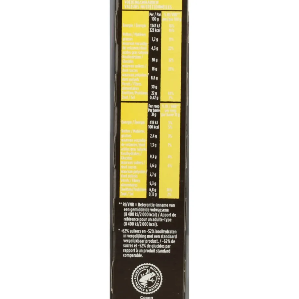 Per 100 g: Energie: 1347 kJ, : 323 kcal, Vetten: 7,7 g, waarvan verzadigde vetzuren: 4,3 g, Koolhydraten: 30 g, waarvan suikers: 18 g, waarvan polyolen: 8,8 g, Vezels: 30 g, Eiwitten: 22 g, Zout: 0,42 g, (*) RI = Referentie-inname. % RI* per 100 g: Energie: 16%, : 16%, Vetten: 11%, waarvan verzadigde vetzuren: 22%, Koolhydraten: 12%, waarvan suikers: 20%, waarvan polyolen, Vezels, Eiwitten: 44%, Zout: 7%, (*) RI = Referentie-inname. Per reep 31 g: Energie: 418 kJ, : 100 kcal, Vetten: 2,4 g, waarvan verzadigde vetzuren: 1,3 g, Koolhydraten: 9,3 g, waarvan suikers: 5,6 g, waarvan polyolen: 2,7 g, Vezels: 9,3 g, Eiwitten: 6,8 g, Zout: 0,13 g, (*) RI = Referentie-inname. % RI* per reep 31 g: Energie: 5%, : 5%, Vetten: 3%, waarvan verzadigde vetzuren: 7%, Koolhydraten: 4%, waarvan suikers: 6%, waarvan polyolen, Vezels, Eiwitten: 14%, Zout: 2%, (*) RI = Referentie-inname.