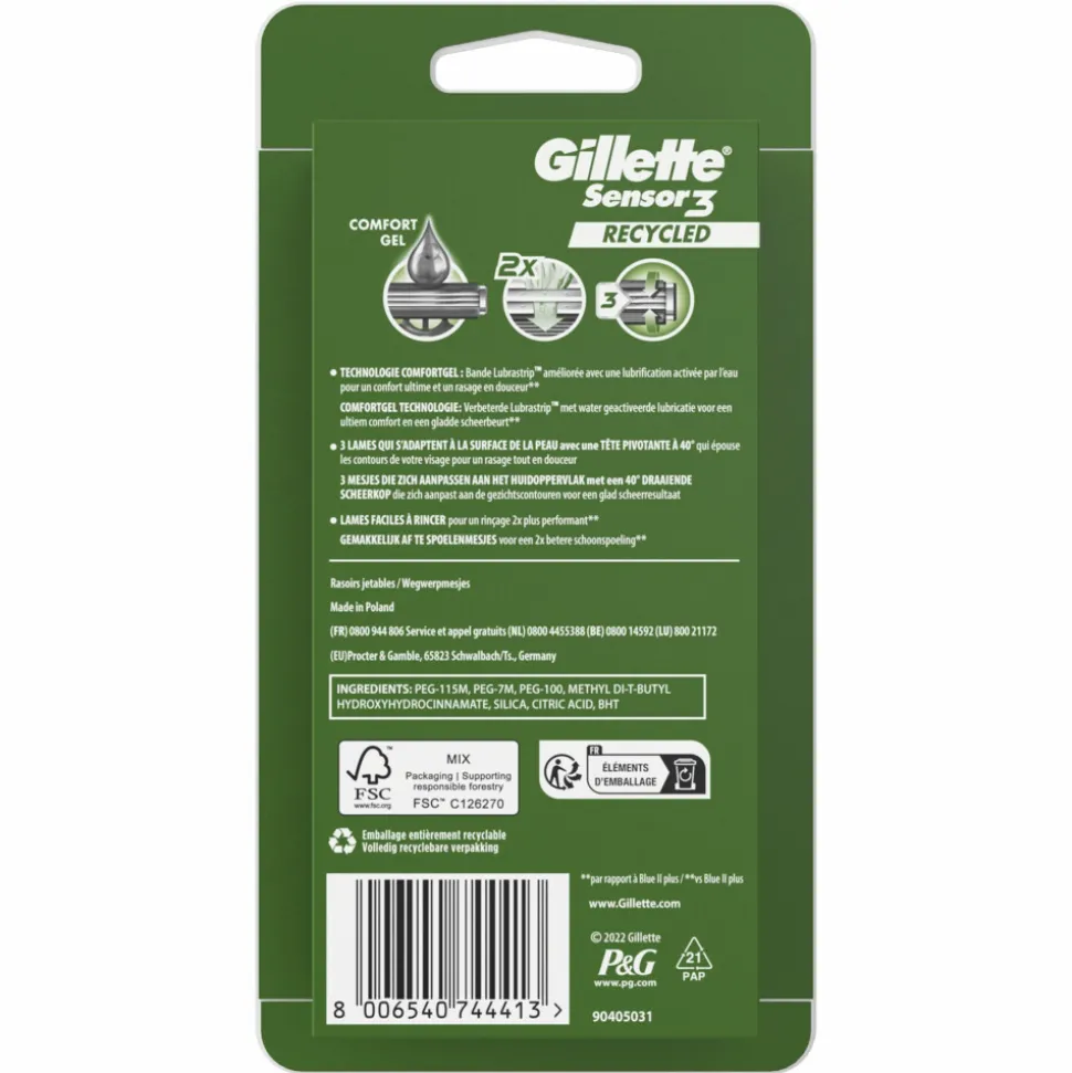- Tot 10 scheerbeurten: Elk Gillette Sensor3 Recycled wegwerpmesje geeft je tot 10 gladde, soepele scheerbeurten