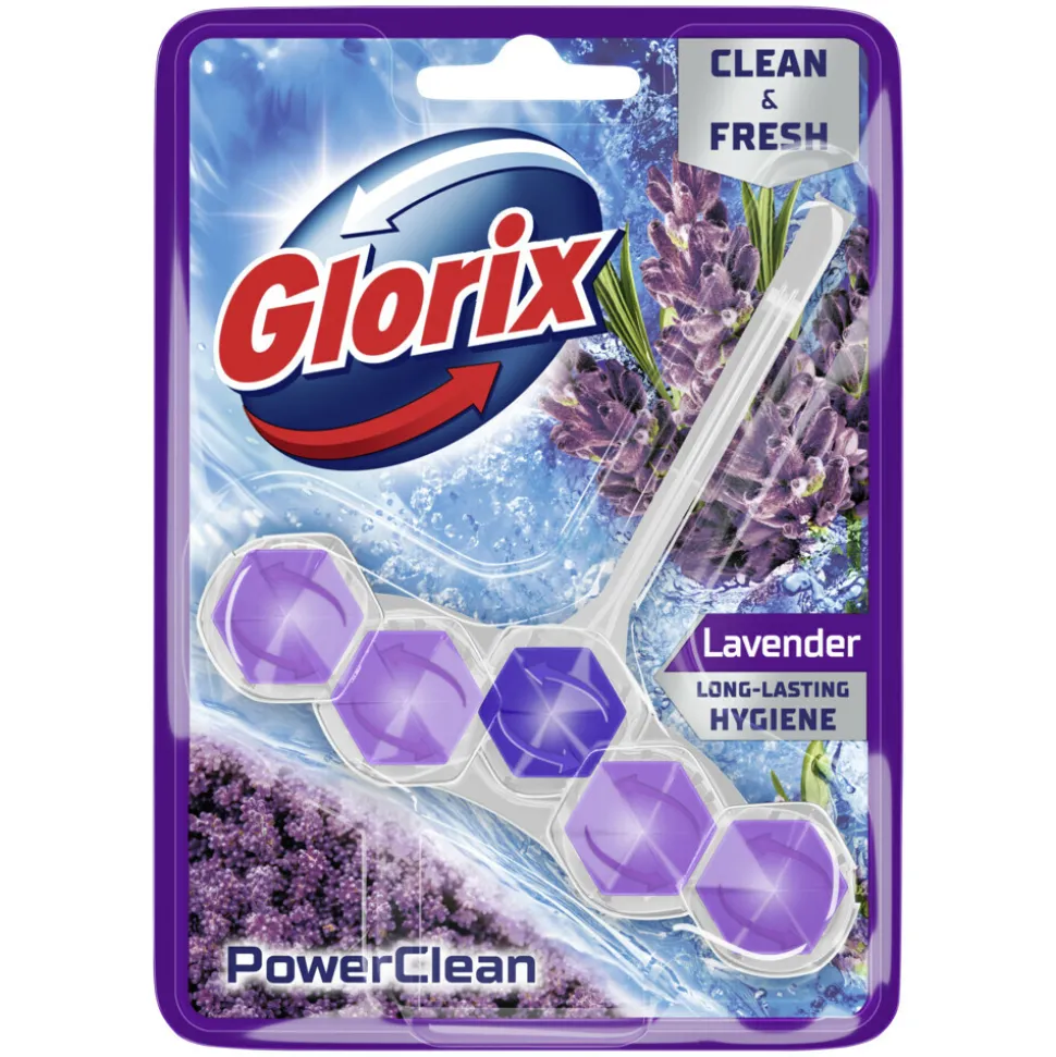 Het Glorix Power Clean Lavendel Toiletblok met anti-kalkwerking houdt je toilet lang fris en zorgt bovendien voor glans en een hygiënische reiniging.