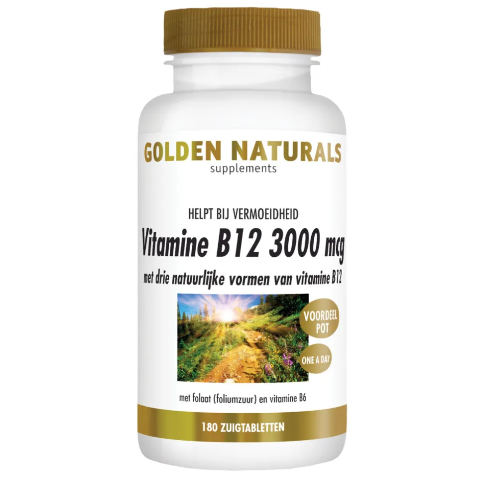 Golden Naturals Vitamine B12 3000mcg bevat drie natuurlijke vormen van vitamine B12: methylcobalamine, adenosylcobalamine en hydroxocobalamine. Deze combinatie ondersteunt de opbouw en benutting van vitamine B12-voorraden in het lichaam en is ideaal voor vegetariërs en veganisten. Vitamine B12 helpt tegen vermoeidheid, activeert natuurlijke energie, en bevordert geheugen, concentratie en de functie van het zenuwstelsel en immuunsysteem. De zuigtabletten bevatten ook vitamine B6 en foliumzuur voor extra energie bij vermoeidheid.