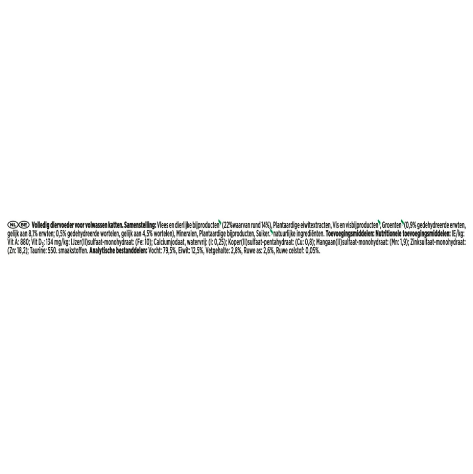 Vlees en dierlijke bijproducten* (waarvan rund 14%), plantaardige eiwitextracten*, vis en visbijproducten*, Groenten* (0,9% gedehydrateerde erwten, gelijk aan 9,1% erwten; 0,5% gedehydrateerde wortelen, gelijk aan 4,5% wortelen), mineralen, Plantaardige bijproducten, Suiker.