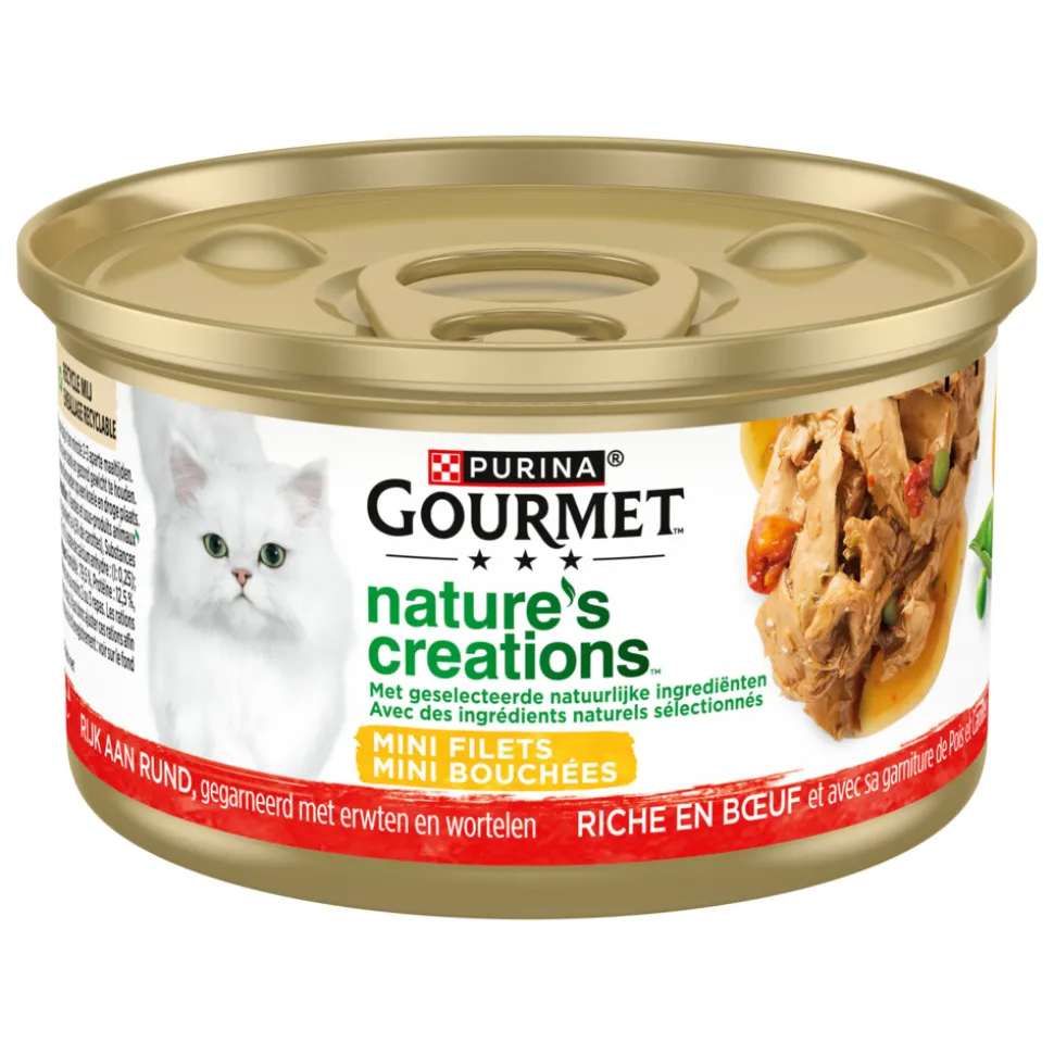 Gourmet Nature’s Creations is een collectie van heerlijke recepten geïnspireerd door de natuur. Deze recepten zijn zorgvuldig gemaakt met geselecteerde natuurlijke ingrediënten van hoge kwaliteit, op vakkundige wijze gekookt en rijk aan rund, lam, gevogelte of vis gegarneerd met groenten zoals spinazie, wortelen of tomaten en rijst. Elk uitstekend recept is gemaakt zodat uw fijnproever kan genieten van iedere hap. Gourmet Nature’s Creations. Heerlijke maaltijden, geïnspireerd door de natuur.