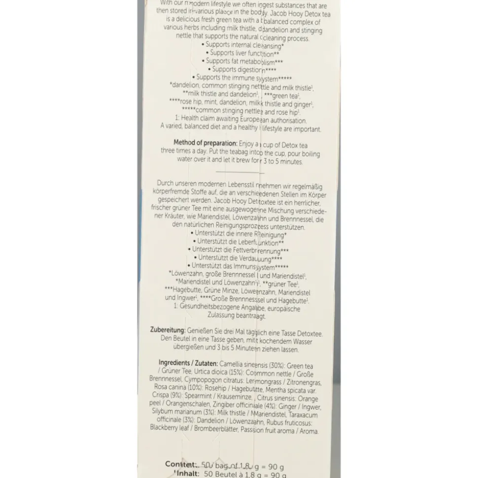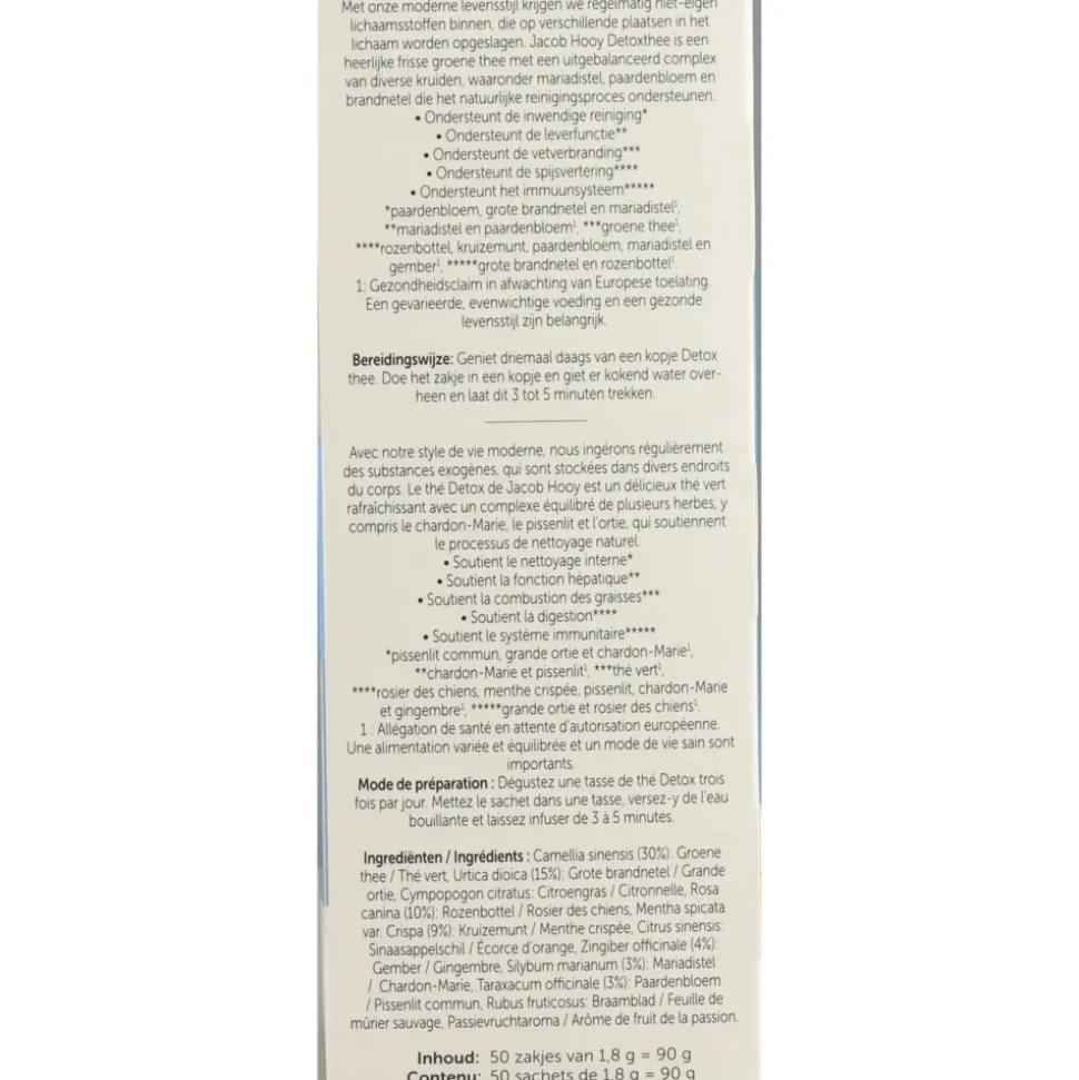 Jacob Hooy Detox Theezakjes is een heerlijke, groene en frisse thee en bevat een combinatie van diverse kruiden, zoals Mariadistel, Paardebloem en Brandnetel die ondersteuning bieden bij het natuurlijke reinigingsproces. Met Jacob Hooy Detox Theezakjes raak je geestelijk en lichamelijk weer in balans en wordt het lichaam gezuiverd. Daarnaast ondersteunt het de spijsvertering en zorgt het voor extra energie en weerstand.