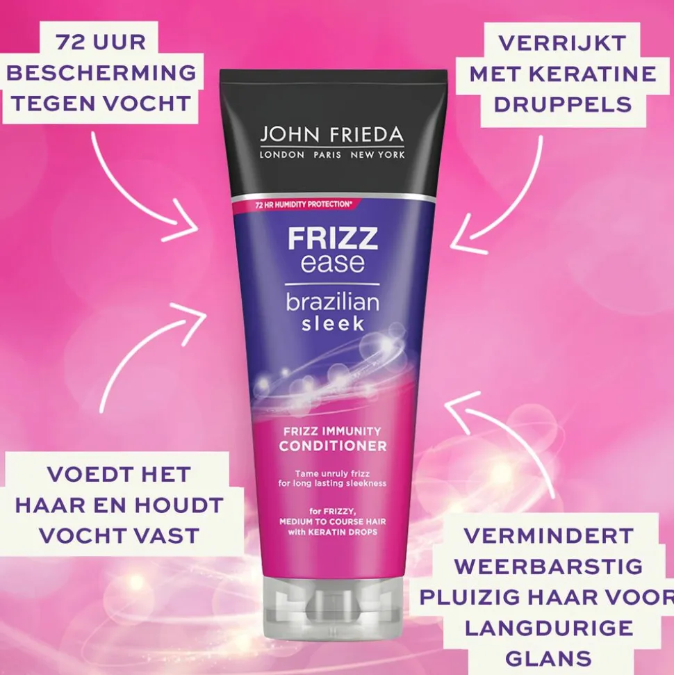 John Frieda Brazilian Sleek conditioner is verrijkt met keratinedruppels en Frizz Immunity Complex. Het voedt het haar en houdt vocht vast, tegelijkertijd helpt deze conditioner bij elk gebruik om geleidelijk immuniteit voor pluis op te bouwen zodat het haar makkelijk te stylen is. Het resultaat is een langdurige gladde, glanzende stijl. Deze lijn bouwt vanaf het eerste gebruik een sterke verdediging op tegen vochtigheid die tot 72 uur houdt, om te voorkomen dat pluis je stijl verpest. Geschikt voor alle soorten pluizig haar. Veilig voor gebruik op gekleurd haar. *Bij gebruik van de hele lijn.