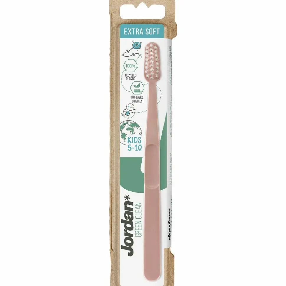 Jordan Green Clean Kids Extra Soft is een hoogwaardig en duurzaam geproduceerde tandenborstel gemaakt van 100% gerecycled plastic gecombineerd met een geweldige functionaliteit. De tandenborstel heeft een moderne en minimalistische uitstraling, waarbij alleen de noodzakelijke materialen gebruikt worden die nodig zijn om een comfortabele poetservaring te garanderen. Deze tandenborstel heeft extra zachte borstelharen. Geschikt voor kinderen van 5 tot 10 jaar.