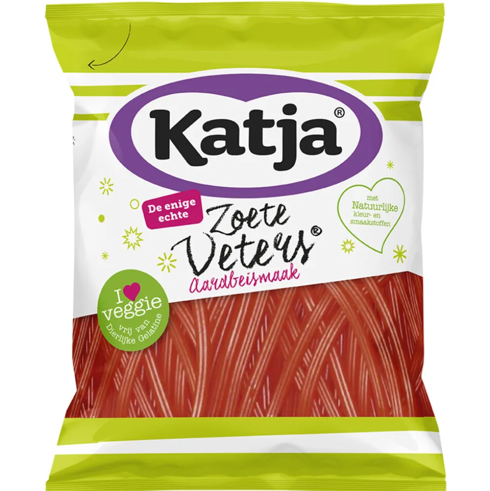 Katja’s zoete veters zijn heerlijke snoepveter met die volle aardbeismaak van vroeger. Gemaakt met natuurlijke kleur- en smaakstoffen en volledig vegan! Dat wordt smullen!
