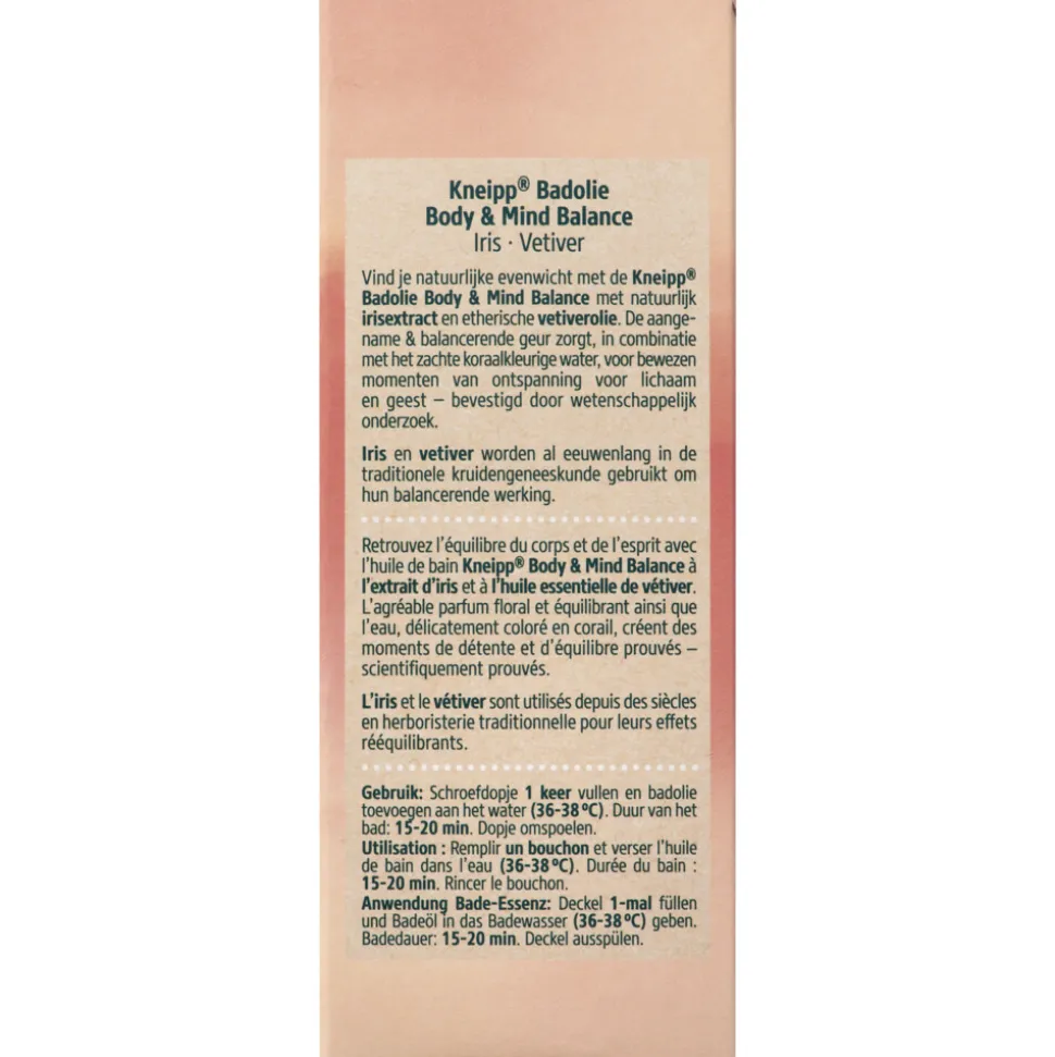 Vind jouw ideale balans en ultieme ontspanning met Kneipp Body & Mind Balance badolie. Of je nu verlangt naar rust na een hectische dag of juist een energieboost nodig hebt, deze badolie met irisextract en vetiverolie past zich aan jouw behoeften aan. Laat de zachte, harmonieuze bloemengeur je omringen terwijl je geniet van een ontspannen badmoment. Bestel nu en ervaar zelf de evenwichtige werking voor extra ontspanning en energie. Hiermee ondersteun je jouw natuurlijke balans.Probeer ook de andere producten van Kneipp Body & Mind Balance zoals de douche foam, douchegel, body lotion of body crème.