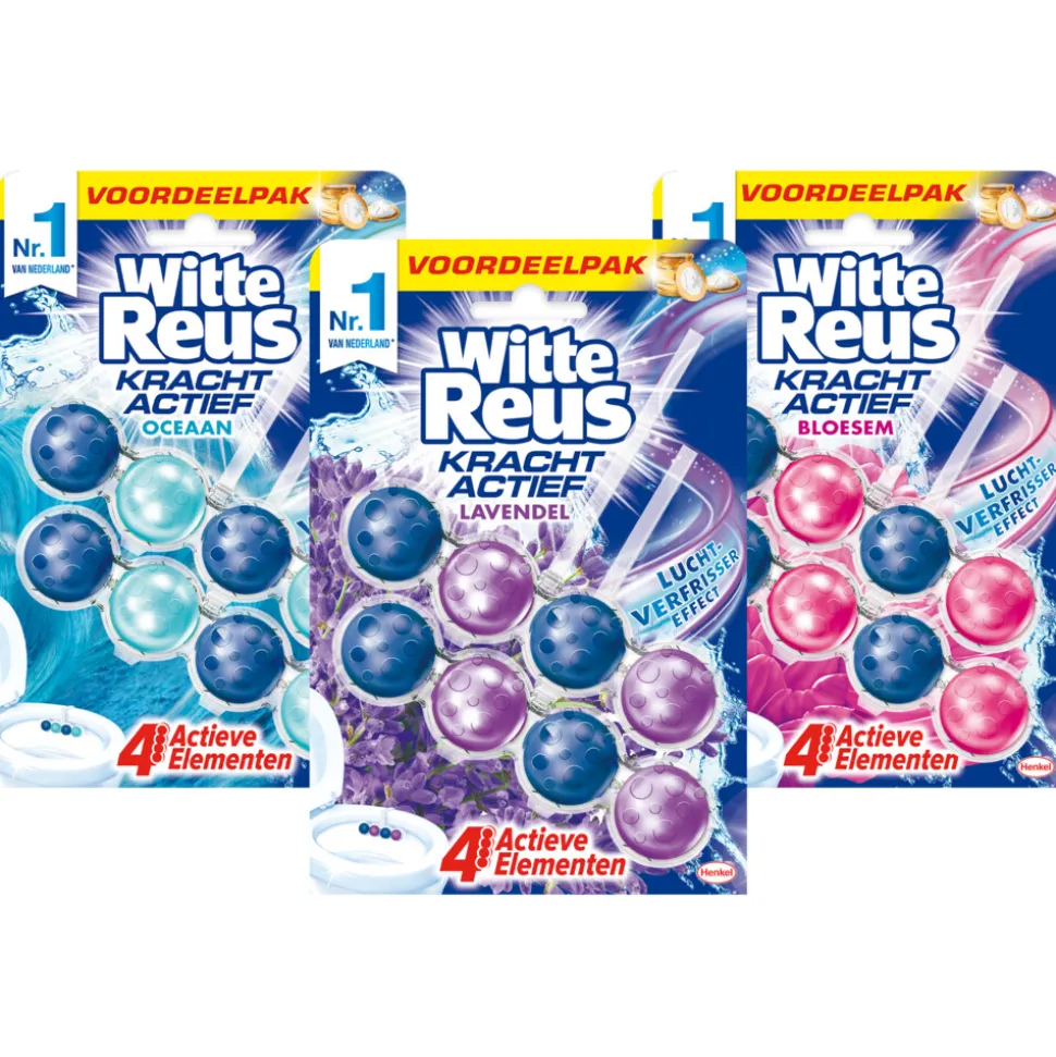 Dit verfrissende pakket van Witte Reus bestaat uit de volgende producten: Witte Reus Toiletblok Kracht Actief Lavendel 2 stuks, Witte Reus Toiletblok Kracht Actief Oceaan 2 stuks en Witte Reus Toiletblok Kracht Actief Bloesem 2 stuks.