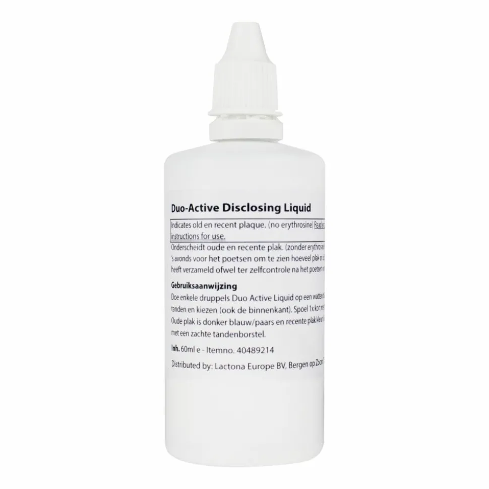 Controleer gemakkelijk en snel of je goed je gebit gereinigd hebt. Duo Active Plak Controle vloeistof; kleurt oude plak donkerblauw en nieuwe plak lila.
