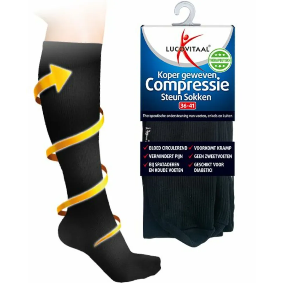 Lucuvitaal Koper Geweven Compressie Steun Sokken maat 36-41 zorgen voor een lichte druk op voeten, enkels en benen en hebben een therapeutische werking. De sokken zijn ideaal om te dragen tijdens het sporten of wandelen, wanneer je de hele dag moet staan of zitten in dezelfde houding en tijdens langere reizen met auto, bus trein of vliegtuig. Voor een optimaal resultaat kunnen de sokken de gehele dag gedragen worden. De sokken zorgen voor de juiste ondersteuning van enkels, kuiten en voeten, voor een optimale prestatie van je benen.