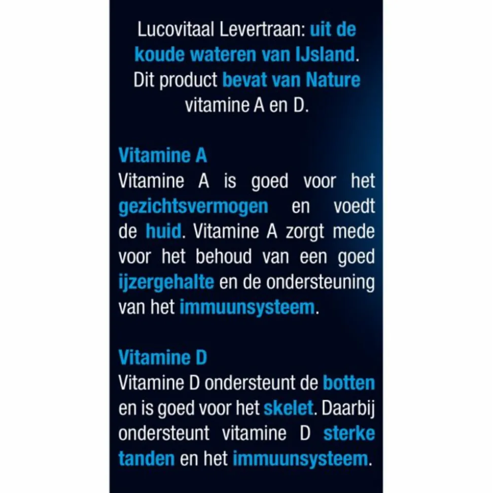Lucovitaal IJslandse Levertraan is afkomstig uit de koude wateren van IJsland en bevat van nature vitamine A en D.