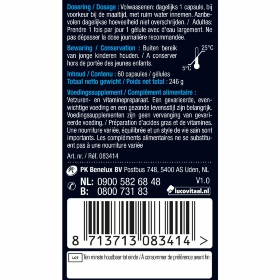 Samenstelling per capsuleLevertraan (Cod Liver oil)250 mgVitamine A (Retinylpalmitaat)400 mcgVitamine D3 (Cholecalciferol)3.4 mcgIngrediëntenLevertraan (vis), Visgelatine, Verdikkingsmiddel (Glycerol).Allergenen informatieBevat vis en producten op basis van vis. Vrij van gluten, lupine, melk en lactose, noten, pinda, sesam en soja. Samenstelling per capsule Hoeveelheid %RILevertraan (Cod Liver oil) 250 mg ** Bevat: Vitamine A (Retinylpalmitaat) 400 mcg 50% Vitamine D3 (Cholecalciferol) 3,4 mcg 68%*RI = Referentie inname.**RI = Referentie inname niet vastgesteld.