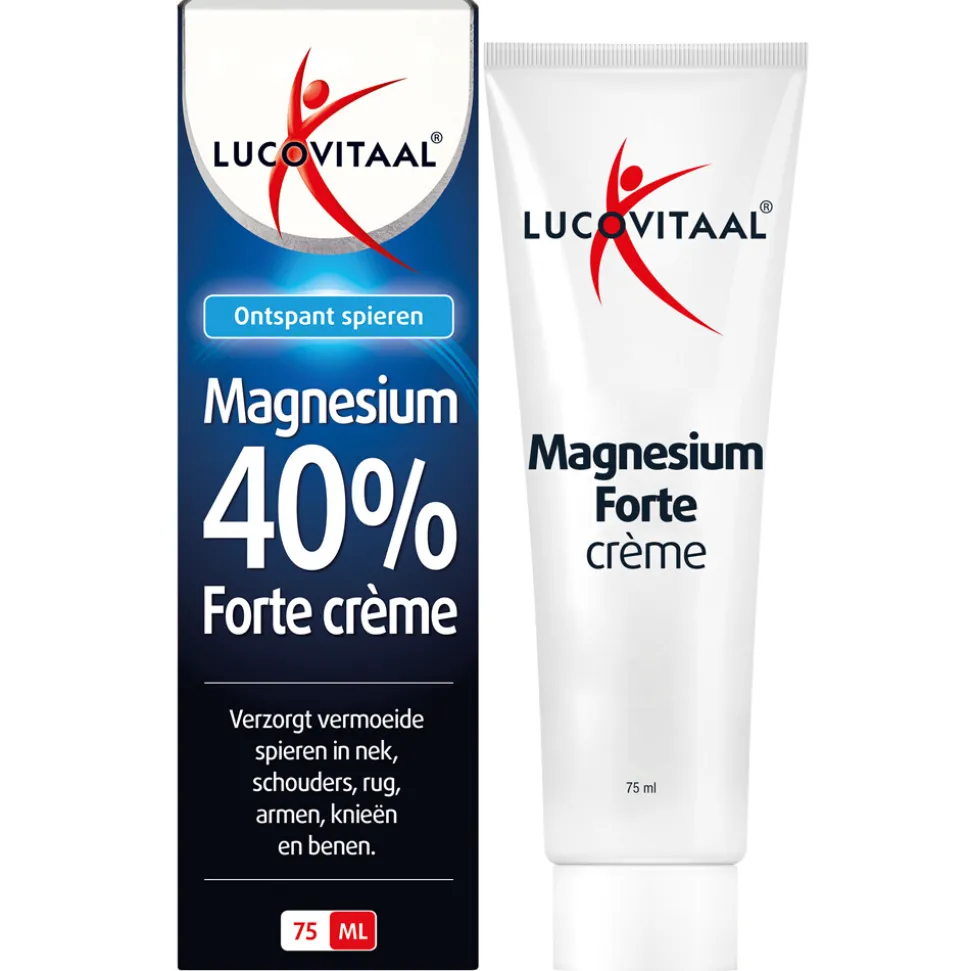 Magnesium Crème van Lucovitaal is de ultieme verzorging voor de spieren! Deze crème bevat namelijk maar liefst 40% magnesiumchloride. Magnesium is goed voor de spieren en speelt een rol bij het behouden van sterke en soepele spieren. Magnesiumchloride wordt snel en effectief opgenomen door de huid en ondersteunt de normale spierwerking. Gebruik de crème voor de spieren in de nek, schouders, rug, armen, knieën en benen. Een heerlijke verzorging voor de spieren na het sporten of na een intensieve werkdag.Magnesium van Lucovitaal wordt gewonnen uit de meest zuivere en hoogst geconcentreerde magnesiumbron ter wereld. Het laat zich goed door de huid opnemen om zowel lokaal als in het gehele lichaam voor verspreiding van magnesium-ionen te zorgen. Dit geeft een weldadig en heilzaam effect.Je kunt de crème meerdere malen per dag naar behoefte aanbrengen op het te verzorgen gebied. De crème is vrij van allergenen, parabenen en kleurstoffen, en laat geen vlekken achter.Lucovitaal Magnesium 40% Forte crème:- Ondersteunt een normale spierwerking in nek, schouders, rug, armen, knieën en benen