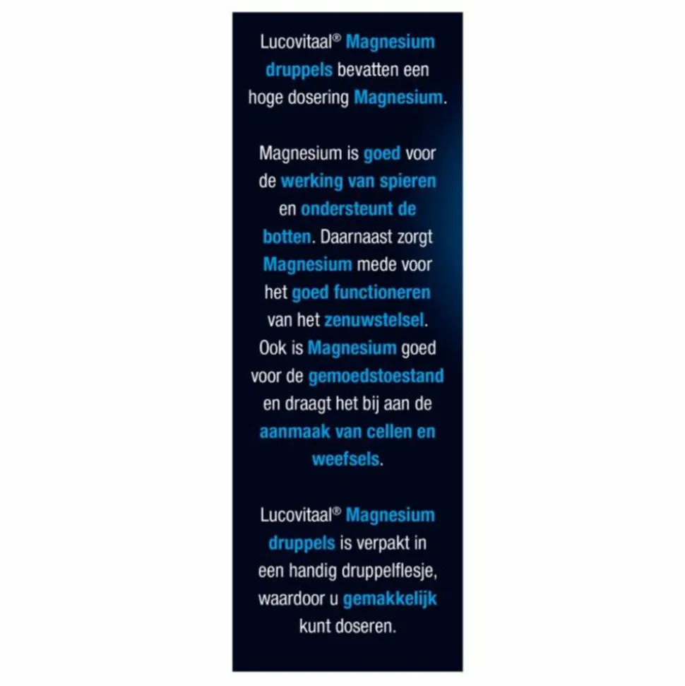Lucovitaal Magnesium Druppels bevatten een hoge dosering Magnesium. Magnesium is goed voor de werking van spieren en ondersteunt de botten*. Daarnaast zorgt Magnesium mede voor het goed functioneren van het zenuwstelsel*. Ook is Magnesium goed voor de gemoedstoestand* en draagt het bij aan de aanmaak van cellen en weefsels*. Lucovitaal Magnesium druppels is verpakt in een handig druppelflesje, waardoor je gemakkelijk kunt doseren.
