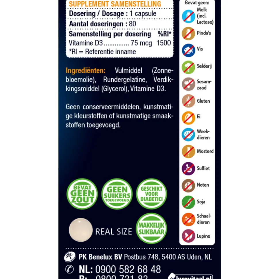 Vitamine D3 75mcg van Lucovitaal Forte bevat maar liefst 75mcg vitamine D3 per kleine, gemakkelijk slikbare capsule. Vitamine D verhoogt de opname van kalk in de botten, ondersteunt de botten en het immuunsysteem, zorgt mede voor een goede weerstand en is goed voor de spieren. Het zorgt voor de opbouw en het behoud van sterke tanden en botten. Vitamine D wordt in de huid gevormd onder invloed van zonlicht. Inname van extra vitamine D wordt door de Gezondheidsraad aanbevolen voor mensen met een donkere huidskleur, mensen die niet voldoende buiten komen, zwangere vrouwen, vrouwen vanaf 50 jaar en mannen vanaf 70 jaar.