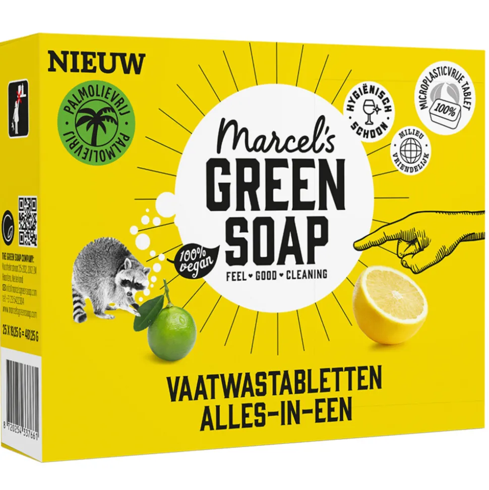 Bij Marcel’s Green Soap vinden ze een ouderwetse handafwas toch het mooiste. Dan voel je je echt de baas over het vuil. Maar ze hebben ook begrip voor de gemak zoekende medemens, en daarom: vaatwastabletten!