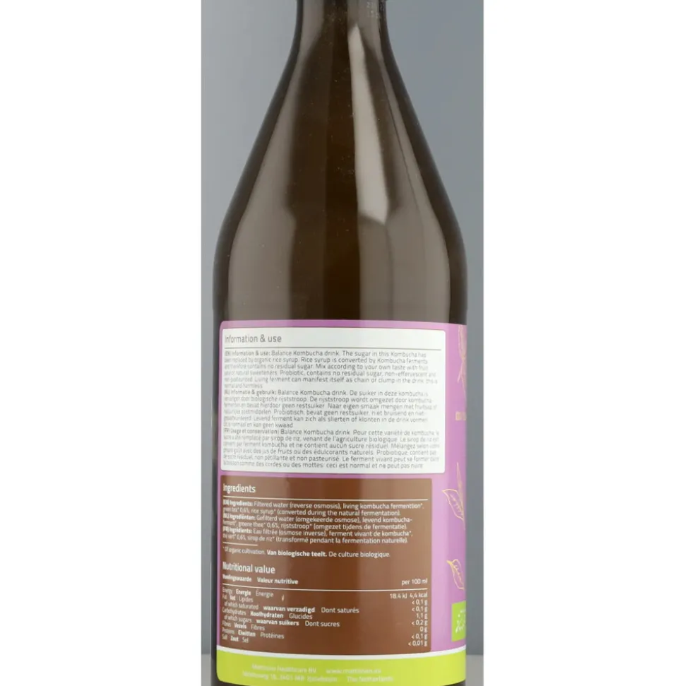 Green Tea Balance Kombucha drink. De suiker in deze kombucha is vervangen door biologische rijststroop. De rijststroop wordt omgezet door kombuchafermenten en bevat hierdoor geen restsuiker. Naar eigen smaak mengen met fruit sap of natuurlijke zoetmiddelen.Probiotisch, bevat geen restsuiker, niet bruisend en niet-gepasteuriseerd.I.v.m. breuk is dit product alleen via winkels verkrijgbaar.