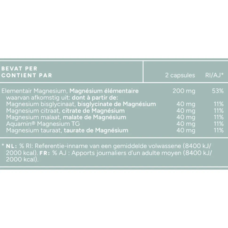 Magnesium tauraat, Magnesium bisglyci naat, Magnesium malaat, Magnesium citraat, Aquamin TG Magnesium, HPMC vegetarische capsule (huls).