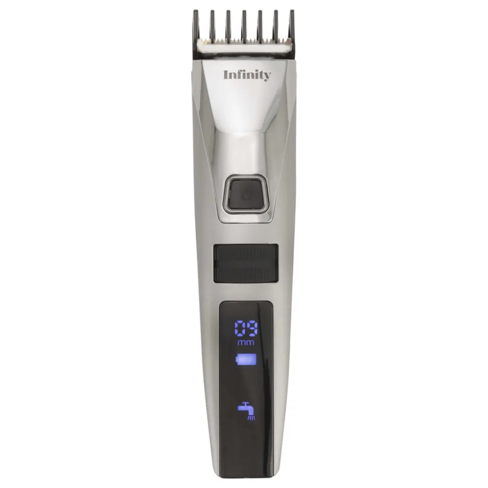 De slimme oplaadbare tondeuse van Melissa, genaamd de Infinity haartrimmer, is uitgerust met een LED display dat je overzicht geeft en je instellingen bijhoudt. Je kunt kiezen uit 8 verschillende lengtes tussen 3 en 22 mm, waardoor de tondeuse gemakkelijk kan worden aangepast aan je persoonlijke behoeften, of je nu alleen de zijkanten wilt trimmen of het hele haar wilt knippen. De tondeuse heeft een oplaadtijd van slechts 1,5 uur en kan daarna een uur lang worden gebruikt voordat deze opnieuw moet worden opgeladen. Om de messen gemakkelijk schoon te maken, kunnen ze worden losgemaakt en afgespoeld. Na 30 minuten gebruik verschijnt het reinigingssymbool op het display om je eraan te herinneren de messen te wassen en te smeren. De tondeuse wordt geleverd met een verstelbare kam, een ERP-adapter, een kam, een reinigingsborstel en smeerolie.