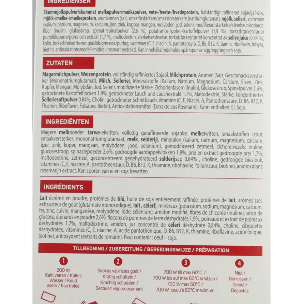 Magere MELKpoeder, TARWE-eiwitten, volledig geraffineerde sojaolie, MELKeiwitten, smaakstoffen (zout, smaakversterker: mononatriumglutamaat, MELK, SELDERIJ), mineralen (kalium, natrium, magnesium, calcium, ijzer, zink, koper, mangaan, molybdeen, jood, selenium), gemodificeerd zetmeel, cichoreivezels: inuline, glucosestroop, spinaziepoeder 2,6%, gedroogde aardappelvlokken 1,9% (kleurstof: curcumine), prei en extract gedroogde prei 1,7%, maltodextrine, zetmeel, geconcentreerd gedehydrateerd selderijsap 0,84%, choline, gedroogde bieslook, vitamines (C, E, niacine, A, pantotheenzuur, D, B6, B12, K, thiamine, riboflavine, foliumzuur, biotine).