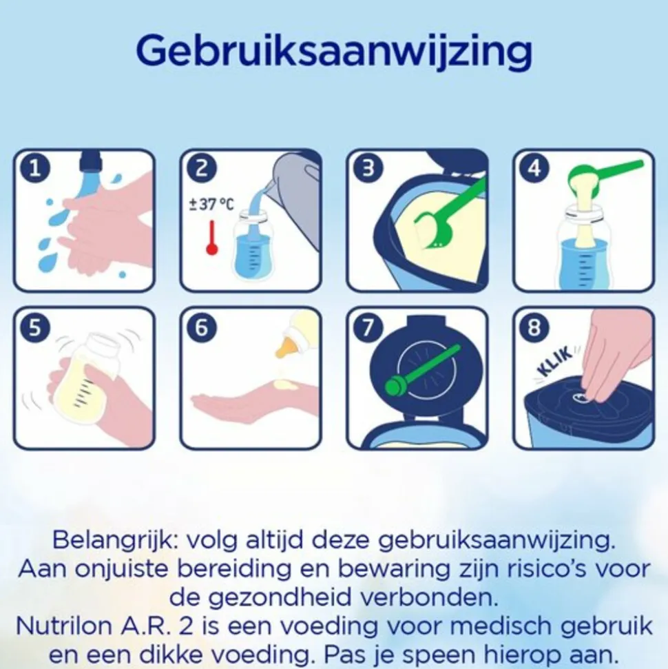 Vitamine D helpt bij de opbouw van botten en tanden. Het is daarom nodig om je kindje elke dag 10 microgram vitamine D extra te geven, in de vorm van druppeltjes of tabletjes. Dit doe je tot je kindje 4 jaar is. Daarbij maakt het niet uit welke voeding je kindje krijgt. Tips/gebruik: Spuugt je baby veel of heeft hij last van andere babykwaaltjes? Wil je graag advies over de voeding? Doe dan de Babykwaaltjestest. Binnen 10 minuten krijg je tips van onze voedingskundigen waarmee je zelf je kleintje kunt helpen. Nutrilon A.R. 2 is een dikkere voeding. Gebruik daarom een speen met een grotere opening. Bereid de voeding op de juiste temperatuur (ongeveer 37 graden) en schud de fles goed (30 seconden), zodat het poeder goed oplost.
