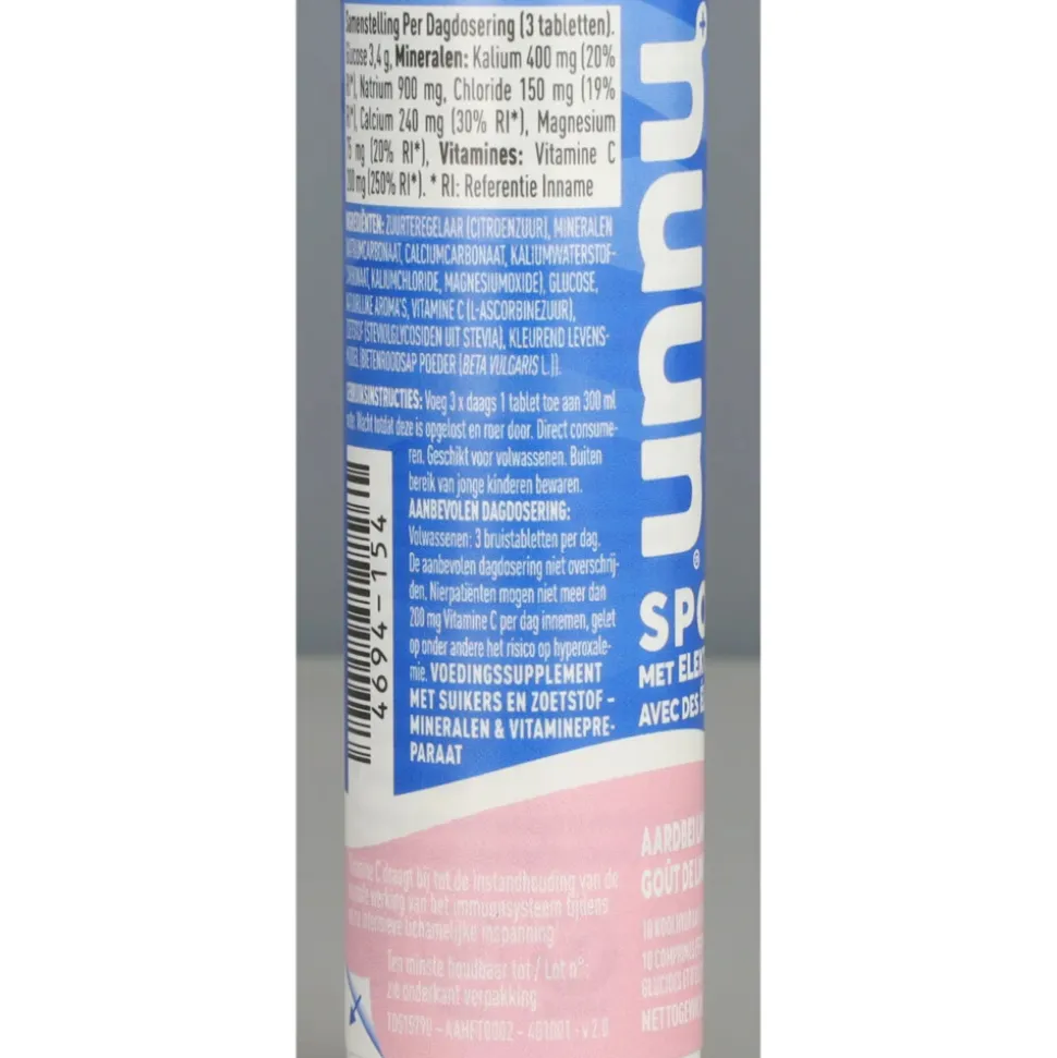 Nuun Sport Aardbei is een smakelijke mix van elektrolyten en vitamine C voor training en onderweg. 1 tube bevat 10 bruistabletten, in de smaak aardbei limonade. Los een tablet in 300 ml water op voor een schone, smakelijke, licht koolzuurhoudende drank. De kleine bubbels zijn goed voor je weestand tijdens en na fysieke inspanning. Vitamine C draagt bij tot de instandhouding van de normale werking van het immuunsysteem tijdens en na intensieve lichamelijke inspanning.