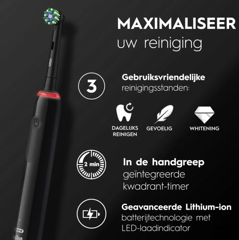 Ervaar de Oral-B Pro Series 3 van het nummer één meest gebruikte tandenborstelmerk door tandartsen wereldwijd. De Pro Series 3 elektrische tandenborstel helpt je te poetsen zoals jouw tandarts dat aanbeveelt: Het helpt je 2 minuten poetsen met de professionele timer en meldt je om de 30 seconden dat je een andere zone moet poetsen. Je beweegt de borstel gewoon in jouw mond en de unieke, ronde borstelkop van Oral-B doet de rest. Hij verwijdert tot 100% meer tandplak dan een gewone manuele tandenborstel voor gezonder tandvlees en maakt jouw glimlach witter vanaf de eerste poetsdag door oppervlakkige verkleuringen te verwijderen. Dat is niet alles, de tandenborstel helpt je ook jouw gevoelige tandvlees te beschermen met de 360 ̊ poetsdrukcontrole die de poetssnelheid vermindert en je waarschuwt als je te hard poetst. De Oral-B Pro Series 3 tandenborstel is onmisbaar voor iedereen die naar een elektrische tandenborstel wil overschakelen en zijn mondgezondheid wil verbeteren.