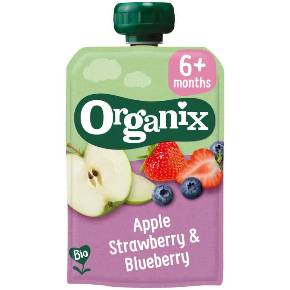Lekker 100% biologische Organix fruithapjes met appel, aardbei en bosbes & peer en framboos in handige knijpzakjes. Van nature zoet, zonder onnodige toevoegingen. Het perfecte tussendoortje! Geschikt voor baby’s (6+m) en peuters.