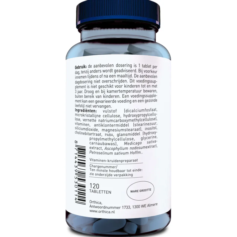 Eén tablet bevat: % RI* Vitaminen vitamine C (L-ascorbinezuur) 50 mg 63 vitamine B1 (thiaminemononitraat) 50 mg 4545 vitamine B2 (riboflavine) 50 mg 3571 niacine (nicotinamide) (vit. B3) 50 mg 313 pantotheenzuur (calcium-D-pantothenaat) (vit. B5) 50 mg 833 vitamine B6 (pyridoxaal-5-fosfaat) 5 mg 357 foliumzuur (vitamine B11) 400 mcg 200 vitamine B12 (cyanocobalamine) 50 mcg 2000 biotine 50 mcg 100 choline (cholinebitartraat) 50 mg Inositol 50 mg PABA (para-aminobenzoëzuur) 50 mg Kruiden – planten(bestanddelen) Ascophyllum nodosum (knotswier) (0,085% jodium) 3 mg Petroselinum crispumextract (peterselie) 3 mg *RI = Referentie Inname, vitaminen, maltodextrine, vulstof (microkristallijne cellulose), cholinebitartraat, inositol, PABA, Petroselinum cripsumextract, glansmiddel (hydroxypropylmethylcellulose, glycerine), antiklontermiddel (vetzuren, magnesiumzouten van vetzuren), Ascophyllum nodosum.